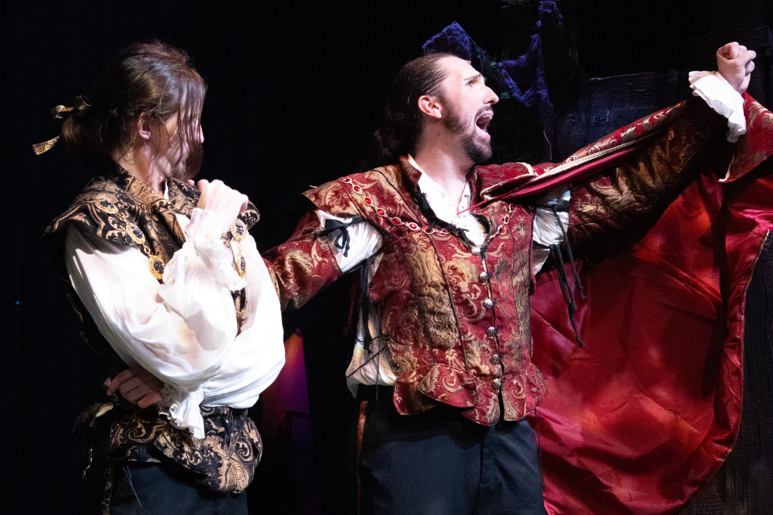 Much of the acting is delivered in tandem with playful musical cues, along with lighting and sound effects. The result is a performance full of camp and whimsy, contrasting with the show’s heavier tones on morality.