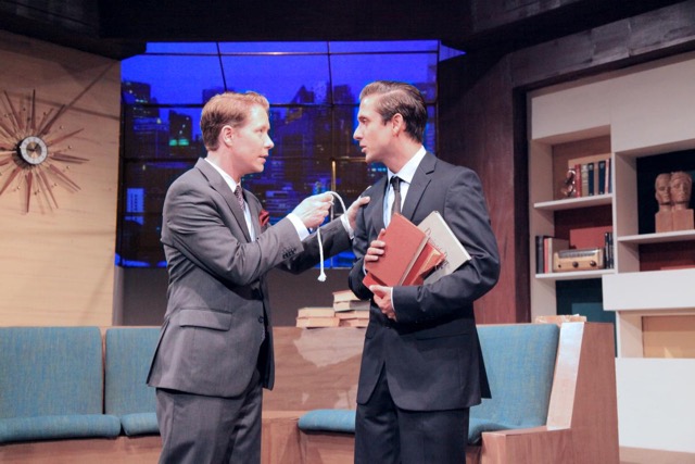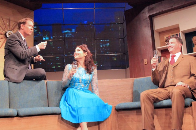 Director Joe Hufferd draws heavily from Hitchcock’s version of the story, and includes obvious homages to the famed filmmaker. The opening murder scene includes an unmistakable nod to Hitchcock’s style, and snippets of the score from Vertigo as used to accent dramatic moments in the plot. However, Hufferd makes the play his own as well, moving the setting to the 1960s and giving the protagonists a swanky penthouse bachelor pad furnished with many pieces acquired from Out of Vogue, a Fullerton furniture that also provided props for the hit AMC television show Mad Men.