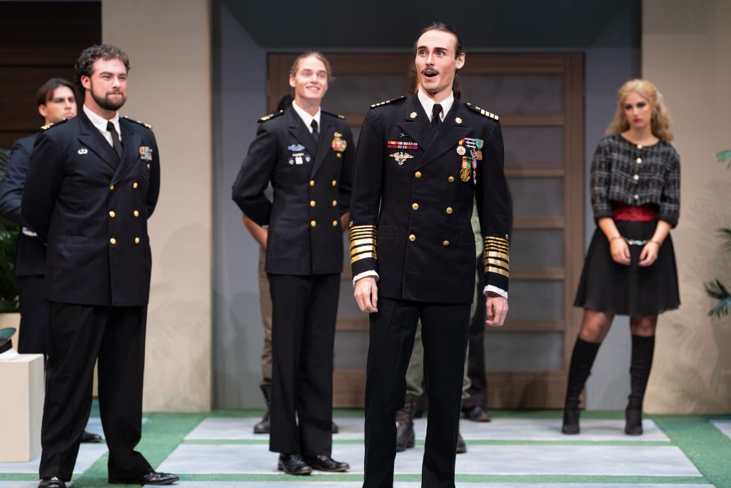 Amanda Martin follows suit with some literal sharp suits and a variety of simple but elegant outfits. Her attempt to bring more modern fashions into this story achieved excellent results. The color palette and variety of costumes worked for these characters: the dapper military uniforms the officers, Hero’s more traditional dresses, and a mix of casual wear for Beatrice.