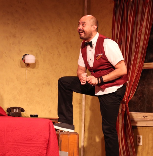 The designer did a great job, the set looks like a seedy hotel room. Everything is stained: walls, carpet, bed spread. The window is heavily smudged. Cheesy paintings are hung on the walls. All of it is in flesh and blood tones, which makes it look even creepier.