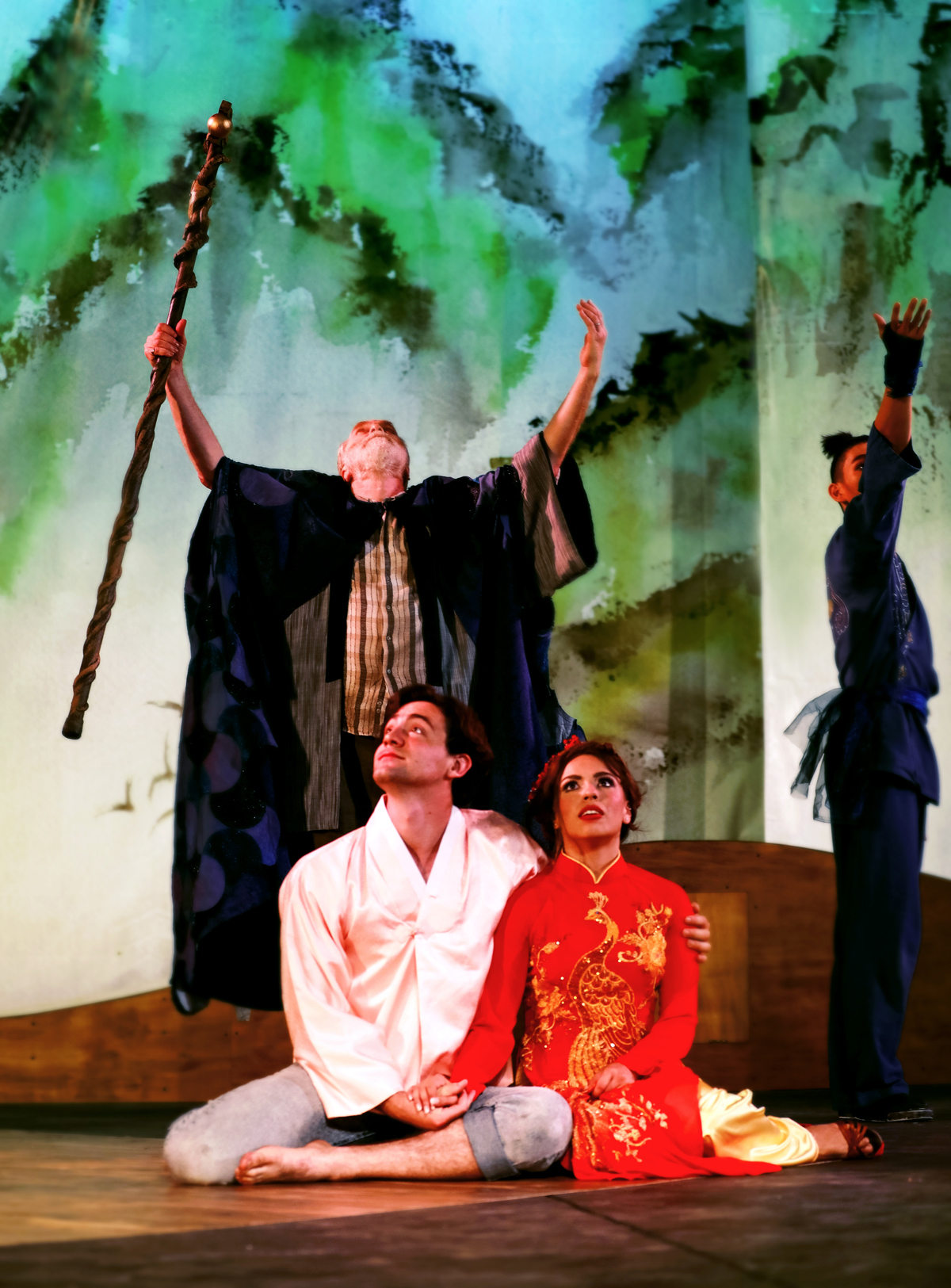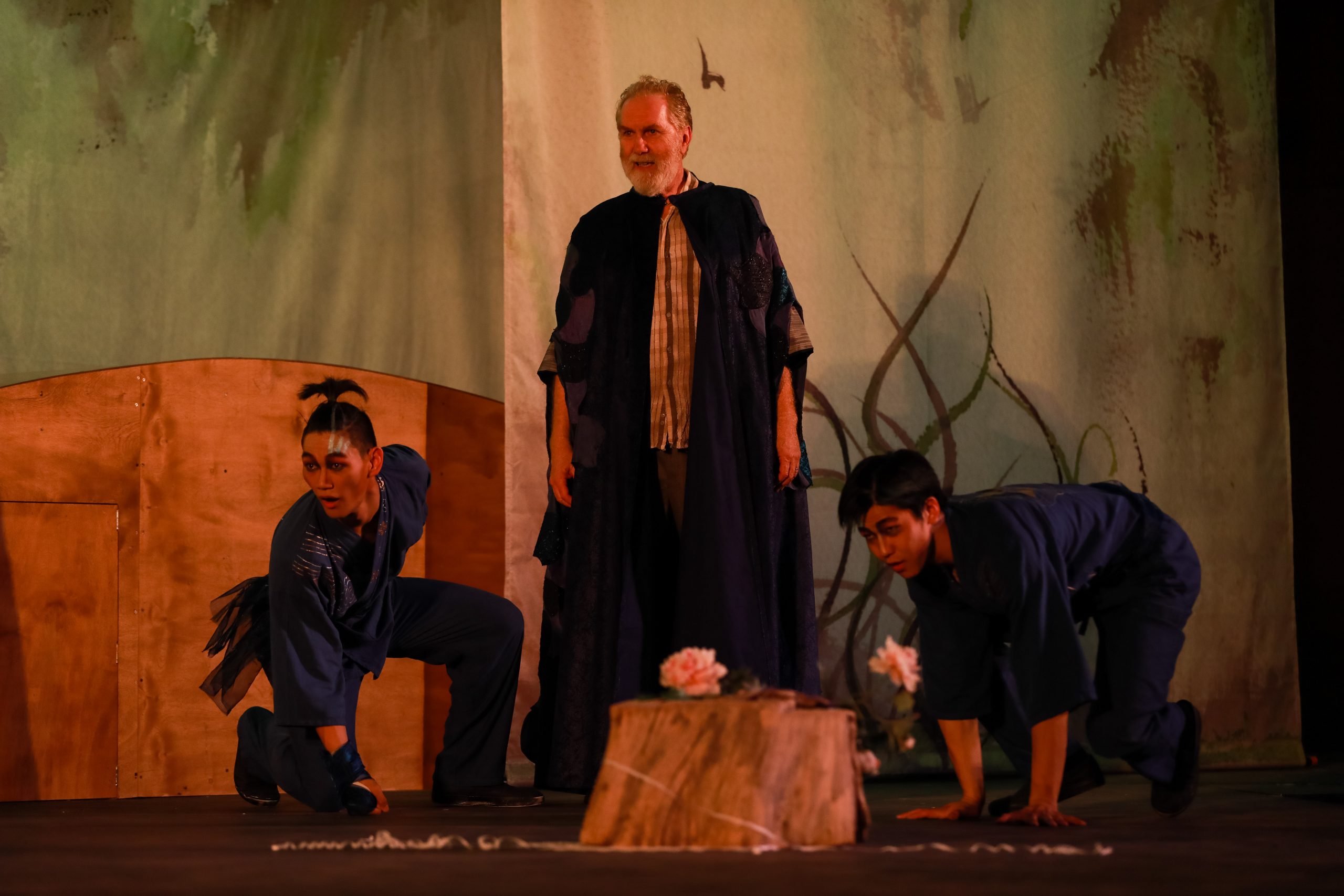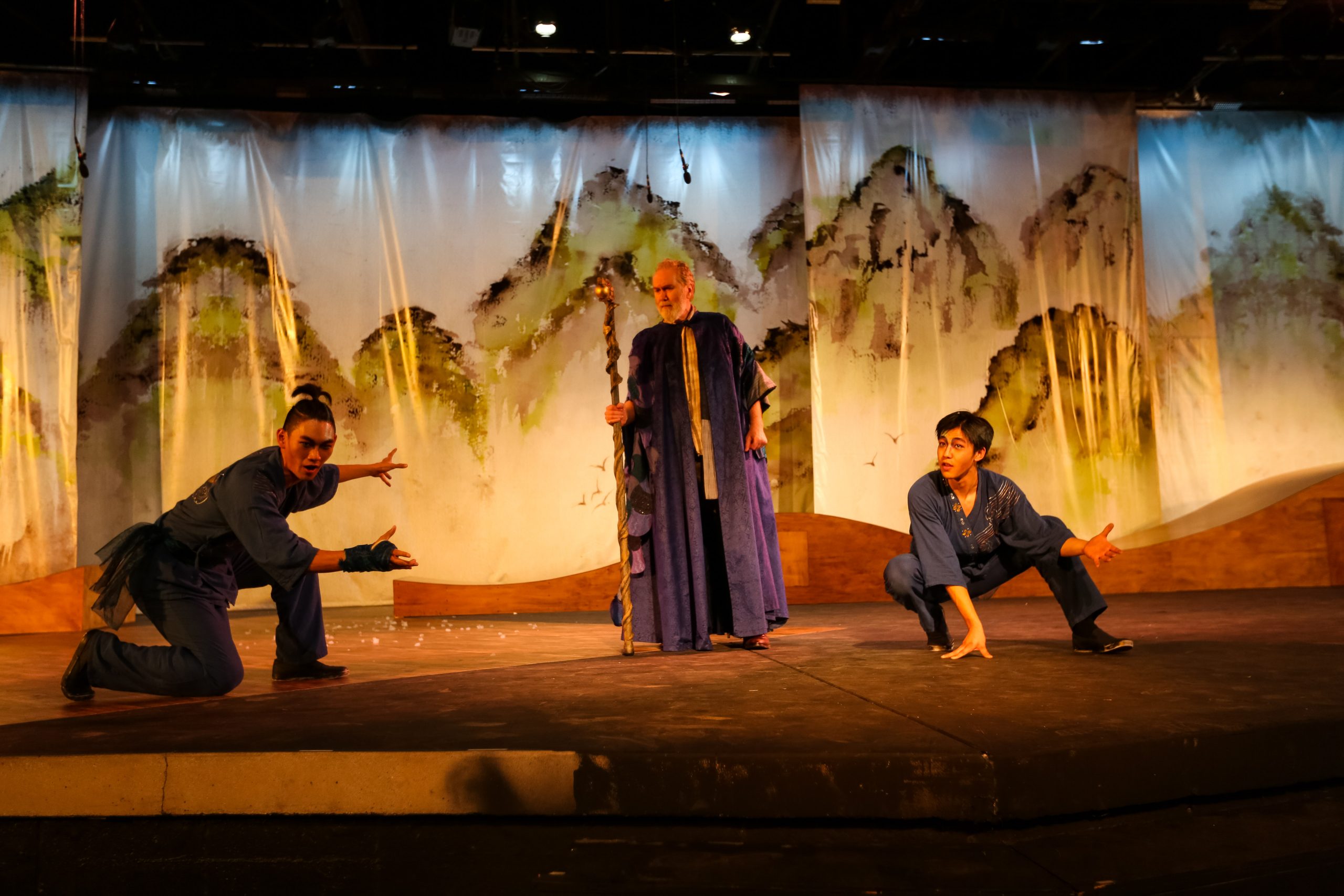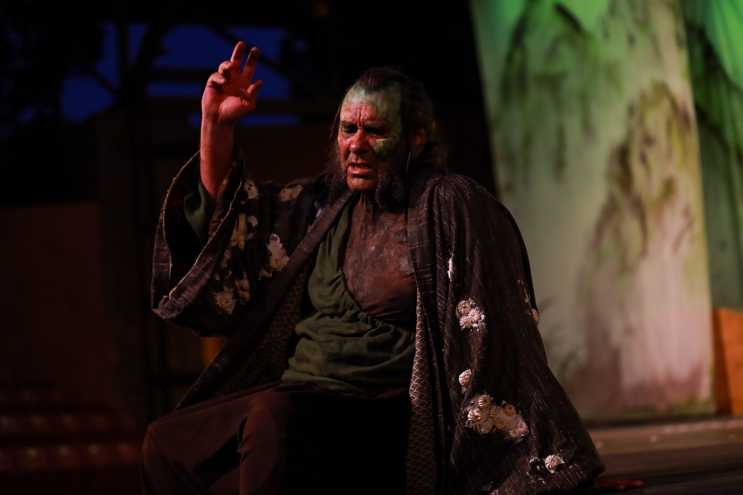 Because of Prospero’s use of sorcery, one might expect an emphasis on magic. Instead, there seems to be an emphasis on the spiritual, with the nigh-on all-powerful spirit Ariel portrayed by numerous dancers. There is also a lot of Asian influence over the infrequent musical performances in the show. When OCR reached out for details regarding the exact culture these sequences were using, we got this as a response, “The director (Peter Uribe) and producer (John Walcutt) wanted a blend of East Asian and Southeast Asian influences to give the island an otherworldly feel without being too specific. While the drumming and dance troupe is Korean, the costumes/makeup/hair of the actors were a blend of Korean, Chinese, Japanese, Vietnamese, etc., influences.” One might think that additions like the Korean drumming show during intermission is unnecessary and a nuisance –after all it is more sitting time in a Shakespeare show –but in reality it draws you in more. The bright colors, vibrant movement, and energetic drumming brings you back to the seats and eager for more island action.