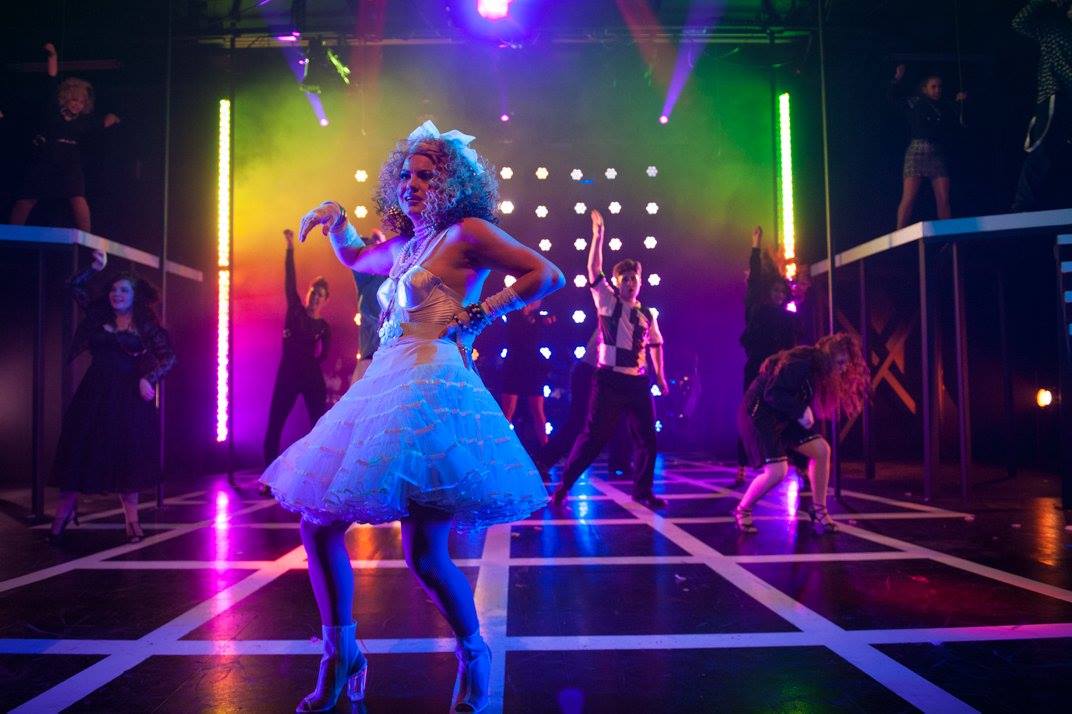 The audience was informed before the show that the theater spent a lot of money on the lights, and boy do they get their money’s worth. The bright multi-colored lights definitely succeed in giving the show the distinctive, eighties music video feel they seem to be going for. While one gets blinded every once in a while (people sensitive to strobe lights beware) the flashing and/or shifting colors generally serve to set the scene or signify an appropriate change in mood. It’s memorable and keeps your attention on the players and their eighties attire, which were never going to be attractive cause it’s the eighties. Therefore, the highest praise they can hope to earn is that the clothes look authentic, and they do.